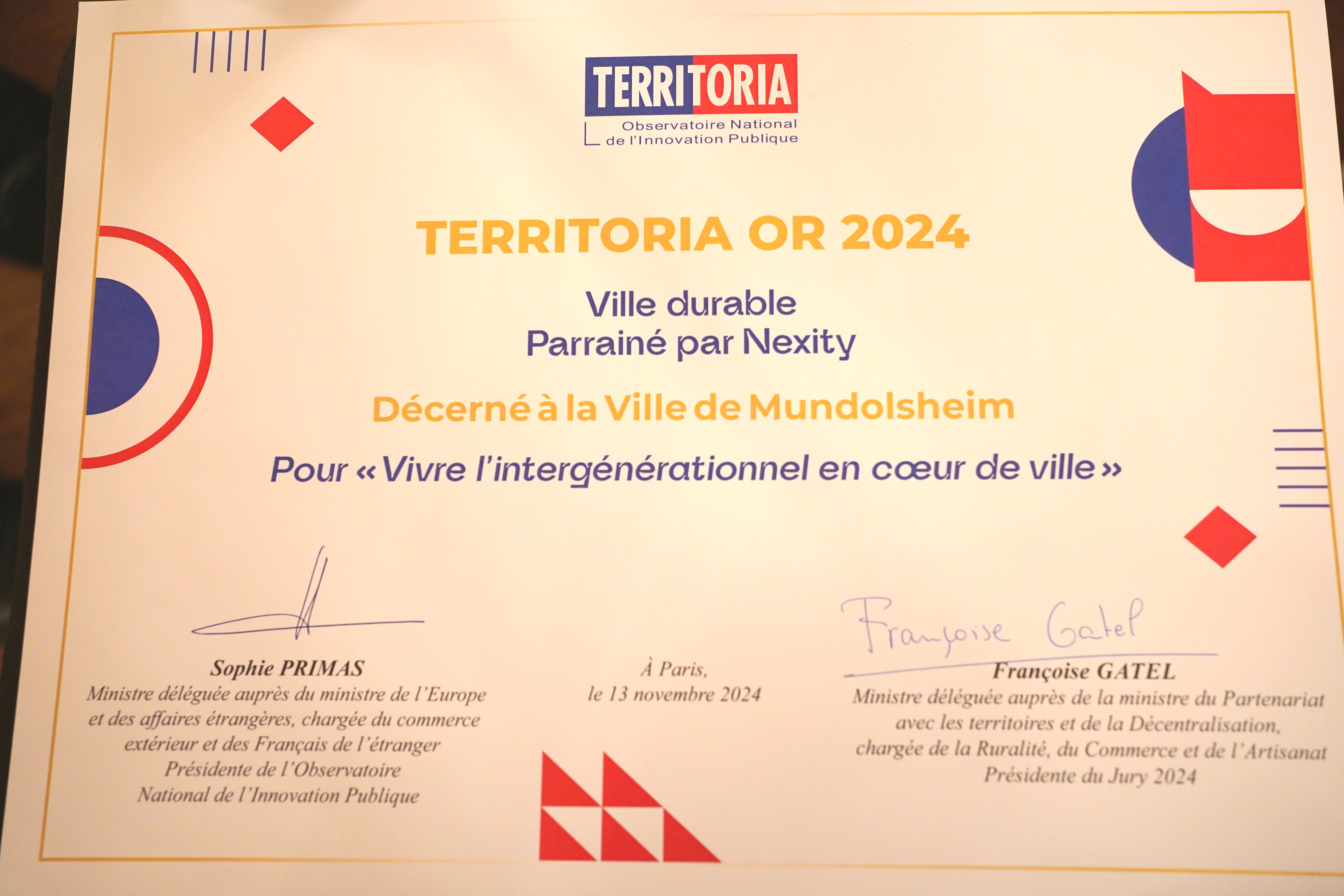 Visionnaire et engagée, la commune s’est vue décerner le prestigieux Territoria d’or 2024 dans la catégorie « Ville durable » pour l’ensemble de son projet en coeur de ville, qui s’inscrit dans un projet global de revalorisation du centre de Mundolsheim. Ce projet a permis de transformer un ancien terrain de football en un espace partagé entre enfants, familles et aînés, favorisant le lien social et la mixité des usages. C’est dans le cadre prestigieux de l’Assemblée nationale, en novembre 2024, que la municipalité s’est vue remettre le prix décerné par l’Observatoire national de l’innovation publique. Il valorise l’engagement de Mundolsheim en faveur d’un urbanisme participatif et écologique, confirmant ainsi son rôle de territoire pilote en matière de développement durable et de cohésion sociale.